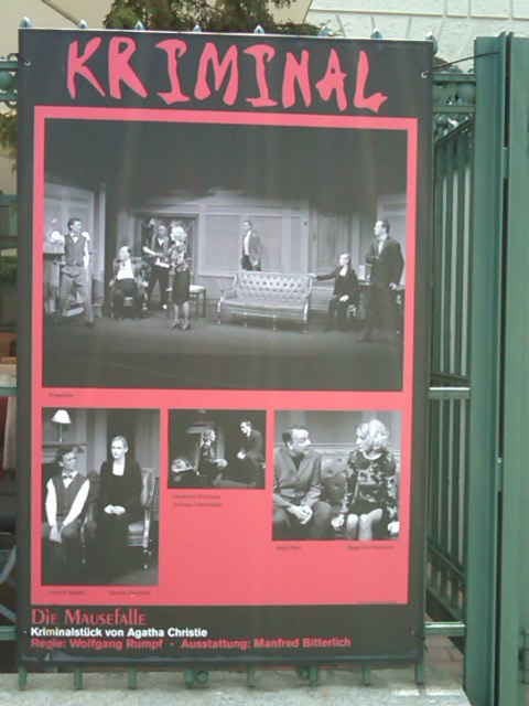 Longest Running Cozy in the World: Agatha Christie’s Mousetrap has been running uninterruptedly in London since November 25, 1952. Last night I saw it here in the Kriminaltheater in Berlin. This theater, with its repertoire of murder mystery plays, from Arsenic and Old Lace to The Hound of the Baskervilles, sits in the heart of old East Berlin, Friedrichshain, right off the Karl-Marx-Allee, now an up-and-coming Bohemian center of the new Berlin. And what is this theater’s biggest hit? Die Mausefalle—The Mousetrap, a quintessentially English murder mystery, set in a chilly guesthouse, Monkswell Manor, outside London, shortly after the second world war. On the repertoire of the Berlin Kriminaltheater since January 2001, it has already had 150,000 visitors, and soon, on June 17, it will have its thousandth performance.